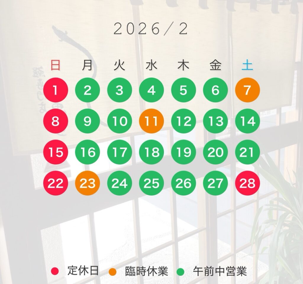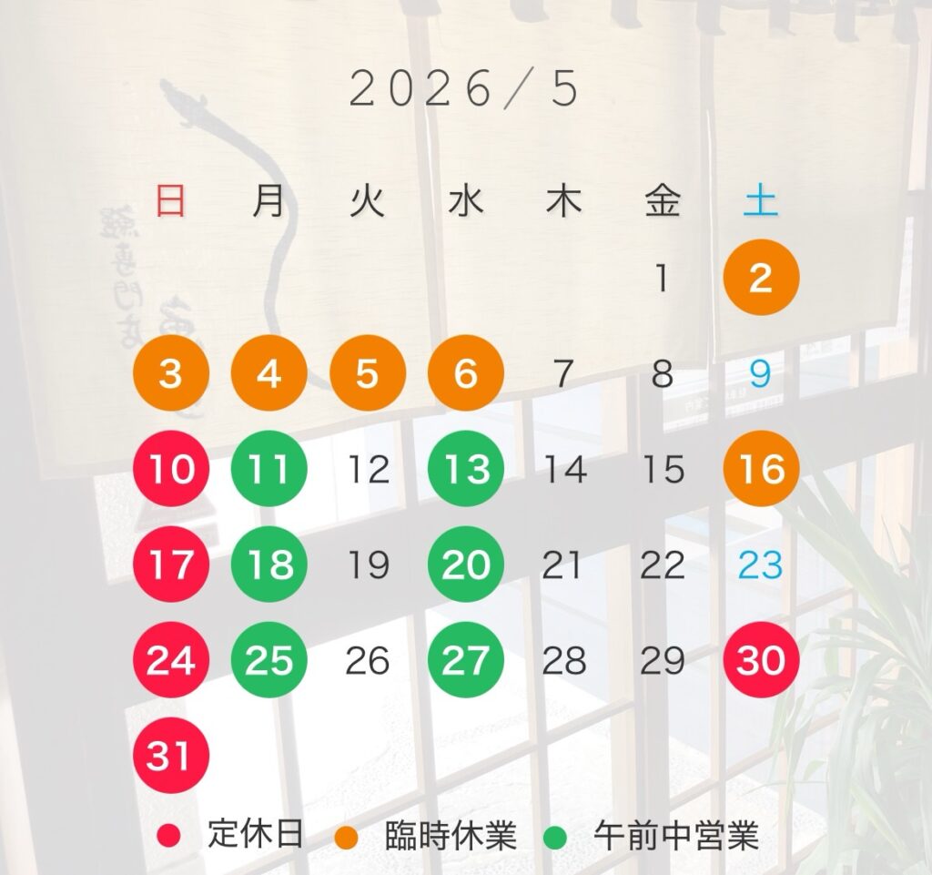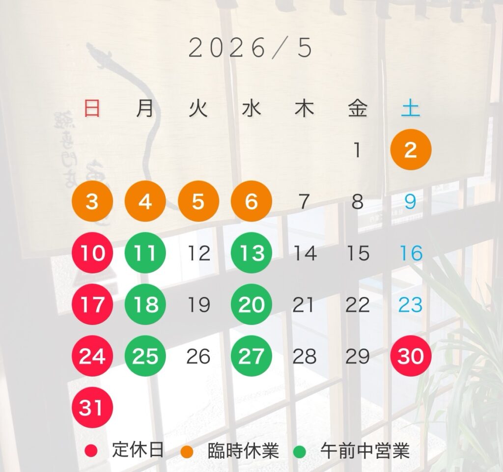 通常休み(毎週日曜、月末土曜)以外にGW/お盆/年末年始はお休みいただきます。HPでもお知らせいたしますのでご確認下さいませ。